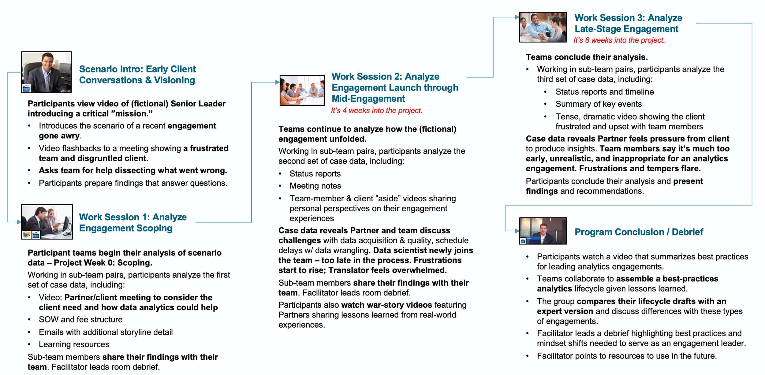 Live instructor-led (ILT) and eLearning versions in which participants perform an after-action review of a data-analytics engagement gone wrong by analyzing key documents and watching videos of engagement meetings. The approach helps learners discern leading practices & mindset shifts to adopt to effectively lead data analytics engagements and identify how the engagement lifecycle differs from traditional engagements.